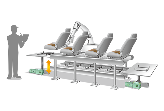 天井搬送用コンベヤへの昇降機構に採用し、高タクト搬送を実現