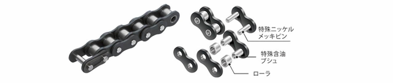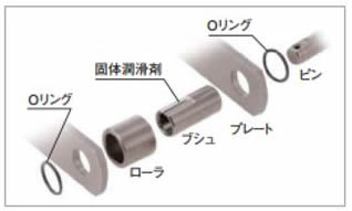 チェーンのピン~ブシュ間に固体潤滑剤を圧着し、リンク~リンク間にOリングを装着した仕様です。