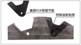 スプロケットの歯部のみを取替可能とし、さらに歯底部に特殊溶射処理を施しています。