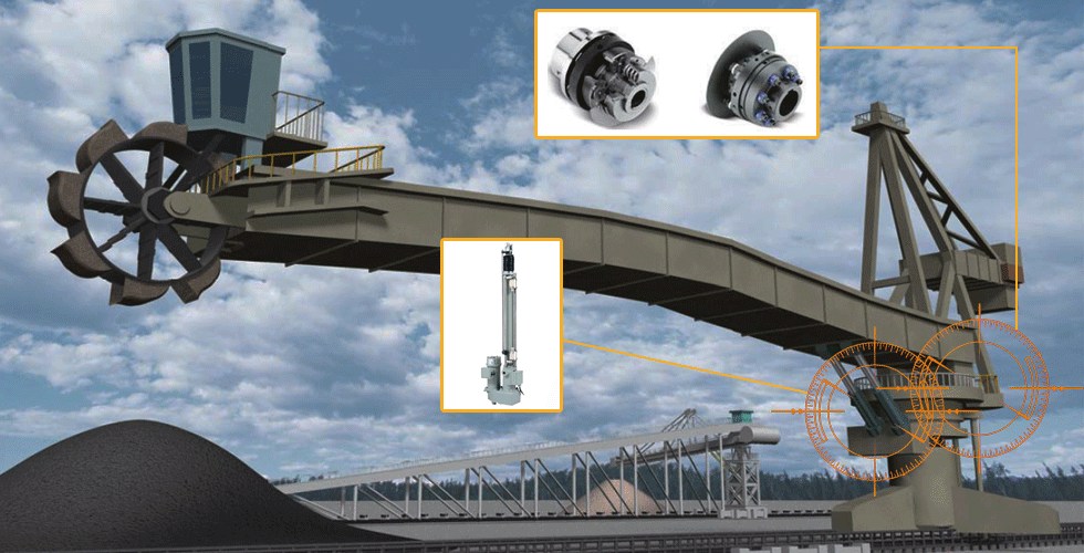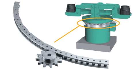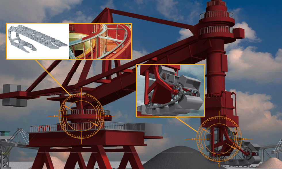 リクレーマの旋回リングギヤはピニオンによって駆動されます。つばきの機械式過負荷保護機器は大型の装置でも石炭や破片がギヤに詰まることによる過負荷を瞬時に防ぎます。