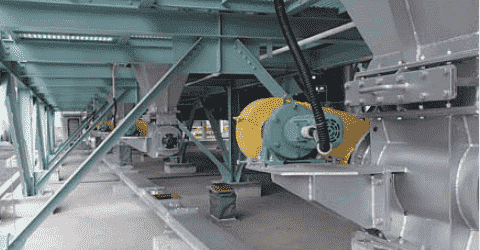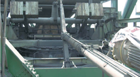 貯蔵場に置いた鉱石などのばら物の払出し用機械です。採取した材料を次工程に払出しします。チェーンに取付けたスクレーパで払出しを行うタイプです。