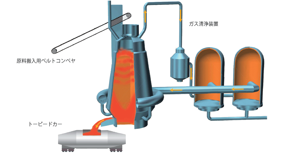 鉄鉱石から鉄を作る設備です。炉の頂部から鉄鉱石とコークスを交互に装入し、炉の下部より熱風を吹き込みます。コークスの燃焼により発生したCO2ガスで鉄鉱石が還元され鉄になります。炉内の温度は2000°Cにも達し、炉の下より溶けた鉄 (溶銑) として取出されます。