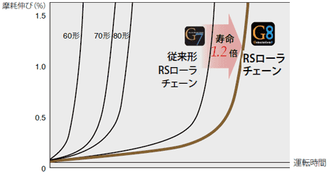 創業100年の節目に、信頼と実績のつばきRSローラチェーン「G7-EX」をさらにリニューアルし、第8世代のRSローラチェーンとして「G8」シリーズをラインアップしました。取扱い性向上を目的に新たな潤滑油を採用し、チェーンのベタつきの抑制と同時に、耐摩耗性が従来比20%向上しました。