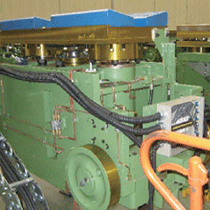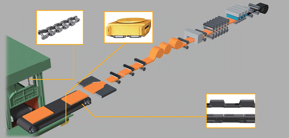 CALやCGLをはじめとする鋼板の表面処理ラインでは、連続で表面処理を行うために、入側ではコイルとコイルのつなぎ目を溶接したり、出側ではコイル巻取り後のカットなどをしたり、不連続な流れになるときにループタワーのキャリッジを昇降させて、蓄えた鋼板をスムースに送り出します。キャリッジの昇降では信頼と実績のつばき強力ドライブチェーン G8シリーズが活躍しています。