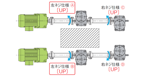 もし、A・Bが右ネジ仕様なら、ネジはC・Dと逆方向[DOWN]に進みます。
