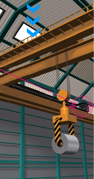 天井走行クレーンは、巻上げ・横行・走行の3動作が可能で、広範囲の作業領域を確保できるため、保管ヤードや製品出荷ヤードのコイル運搬などに使用されています。