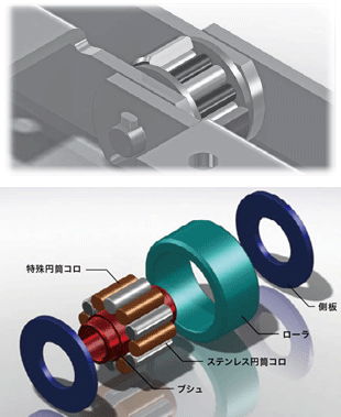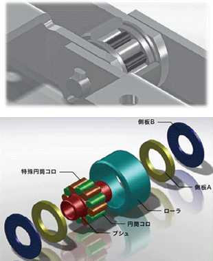 ベアリングローラコンベヤチェーンは、ローラ内部に円筒コロを入れた当社独自の構造です。