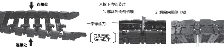 - 1.将平头螺丝刀(先端幅宽3.5mm以下)插入链节内周面的孔内,沿箭头方向撬起打开。