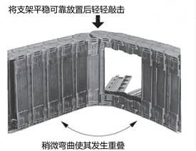 电缆拖链具有弧度,将外周侧放置地面时两端会翘起。在此场合请在两端下方设置枕木,对齐链销孔。