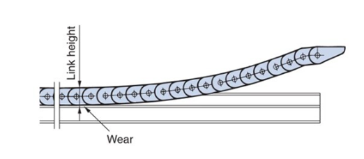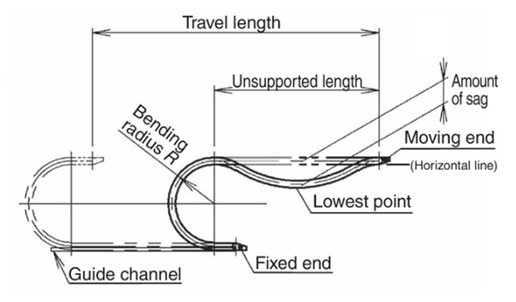 As the cable carrier moves (cycles), the pins and holes in the link connections will wear or the no-back-bend limiting portion will wear, causing sag in the unsupported length portion (see the figure to the right).