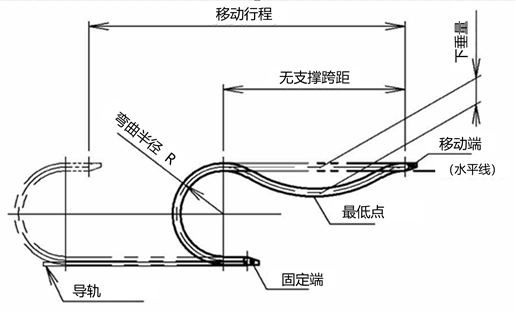 拖链的运行(往复移动)会引起链节连结部链销与孔的磨损,以及非后屈限制部的磨损,导致无支撑跨距部的松垂。(参照右图)