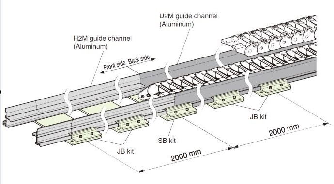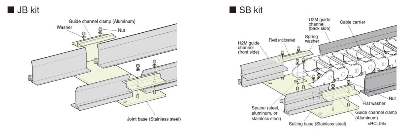 This part is composed of two types of guide channels: the H2M guide channel (front side) and U2M guide channel (back side). This part can be used alone, however, there are two fastening bases (SB kit and JB kit) that can be used to easily install guide channels to the mounting surface quickly and precisely. Guide channel clamps (RCL06) can be used to easily align guide channel joints at connections. Guide channels and guide channel clamps can also be used alone.