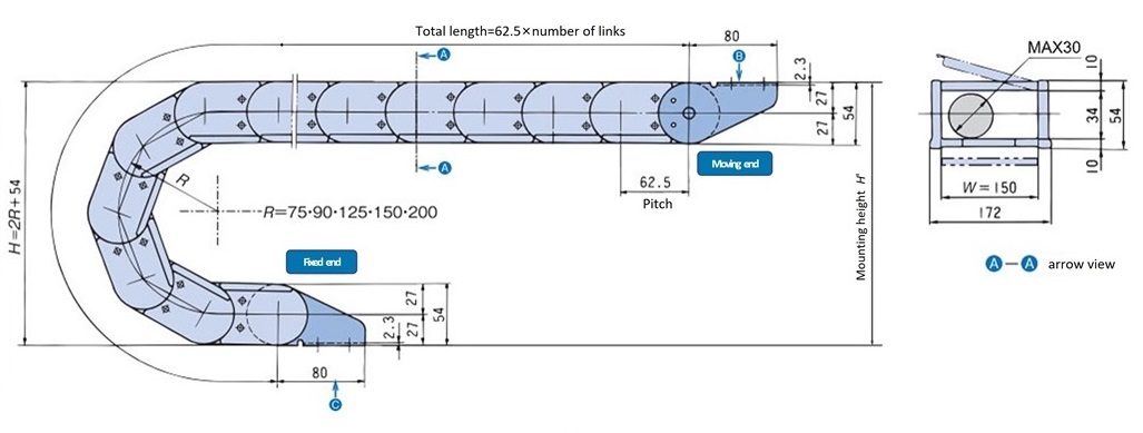 Make the gap between cables/hoses and the divider or link (d in the figure above) to whichever of the following two values is larger: 2 mm or greater or the outer diameter of the cable or hose x 0.1.