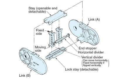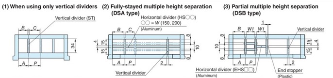 - 2.The divider can slide between W-55. The fastening pitch of fixable dividers is 5 mm increments. However, the pitch of neighboring dividers is 15 mm or greater.