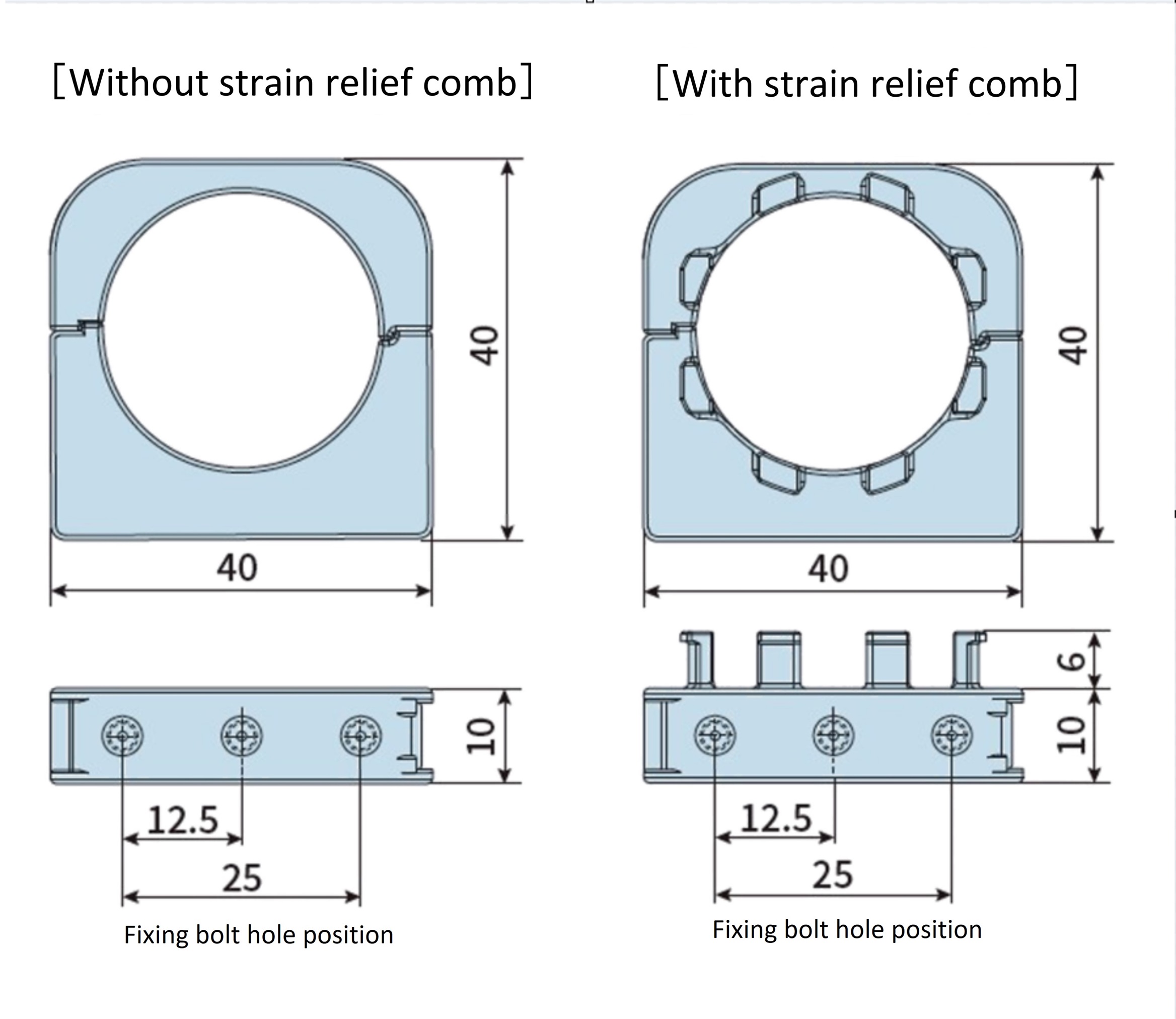 When the robot arm moves quickly, high tension is applied to the cable carrier due to the acceleration. To accommodate this tension, a stainless steel wire is threaded through the hole in the center of link. The clamping piece is attached to one side of the ball-end stainless steel wire to adjust the wire tension. The opposite end from the clamping piece is a stainless steel ball-end structure.