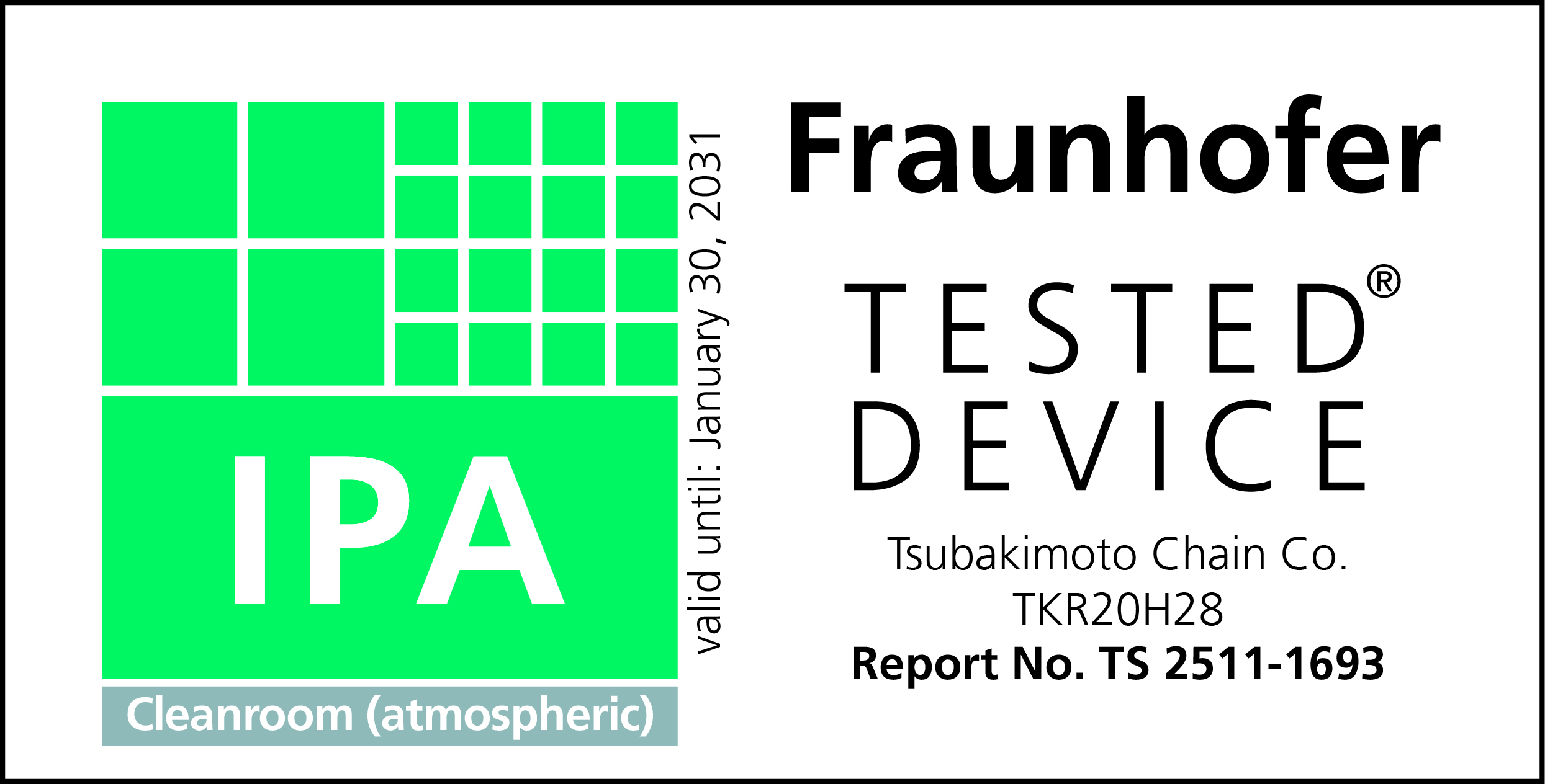 (ドイツ・フラウンホーファー生産工学自動化研究所(IPA)によるISO 14644-1「空気清浄度のクラス分け」に基づいたテストにおいて、ケーブルベヤTKR形(certificate for the product TKR20H28)はISOクラス1を取得)