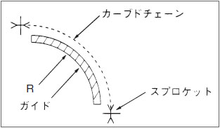 カーブドチェーンは、RSローラチェーンに比べて自由度がありますが、スプロケットには真っ直ぐに噛合うよう、チェーンにガイドを設けてください。