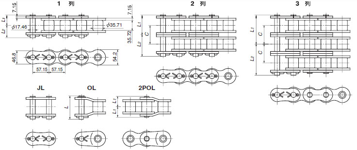 1.1ピッチ形オフセットリンクを使用する場合、伝動能力は表記値の65%になります。