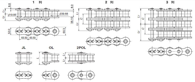1.1ピッチ形オフセットリンクを使用する場合、伝動能力は表記値の65%になります。