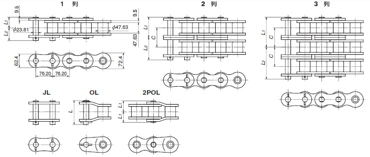 1.1ピッチ形オフセットリンクを使用する場合、伝動能力は表記値の65%になります。