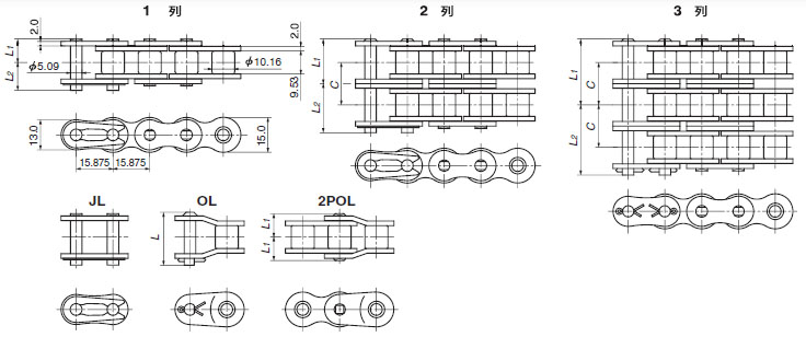 1.1ピッチ形オフセットリンクを使用する場合、伝動能力は表記値の65%になります。