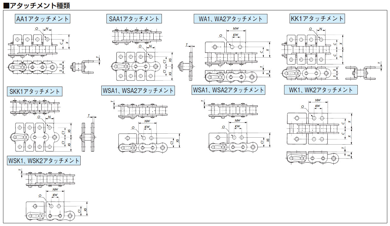 | C | C1 | N | O | S | T | X | XS | NW | NW (内リンクのとき) | KW | アタッチメント 1個当たりの付加質量 kg |