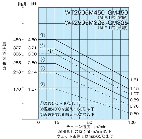 - 注)2. MPD仕様の最大許容張力は普通仕様の80%程度、MPW仕様の最大許容張力は普通仕様の40%程度です。