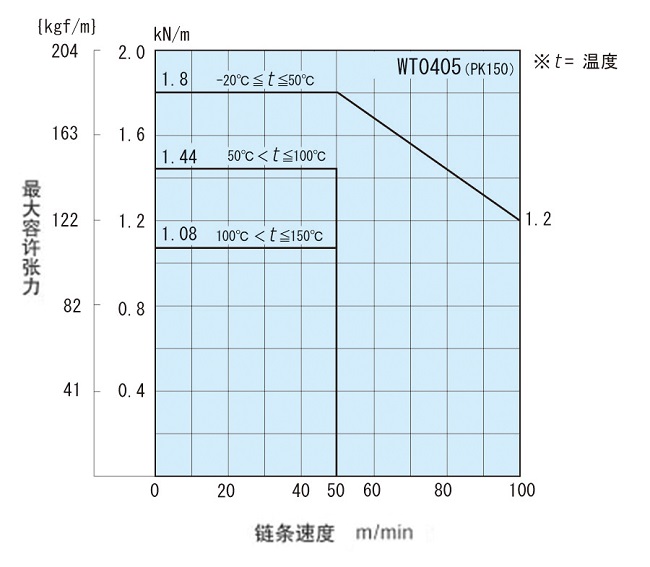 2.最大容许张力为室温(20℃)时,张力均匀作用于整个链条宽度时的值。根据使用条件(温度・速度等)的不同,数值也将改变,请参照链条容许能力曲线图。请将上述链条规格表的最大容许张力换算成链条宽度为1m时的值,按(所需宽度)×(链条宽度1m的最大容许张力)进行计算。
