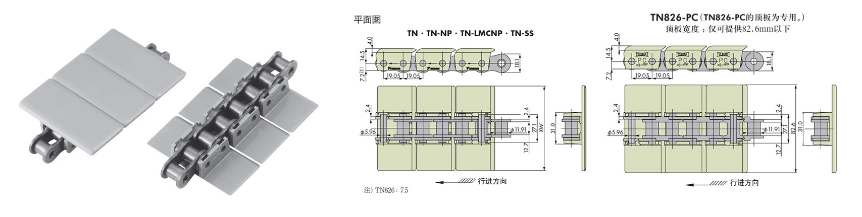 本体链条采用塑料组合链条(TN-C-PC)。连接链节为TN型专用。该顶板链条采用工程塑料和18-8不锈钢制成,具有耐腐蚀性,免加油、低噪音。