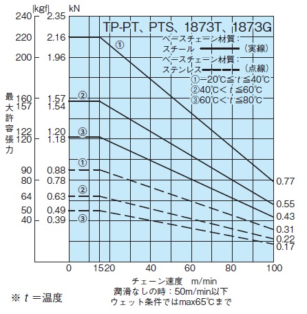 2.チェーン仕様表の使用温度範囲はベースチェーンを加味したものです。