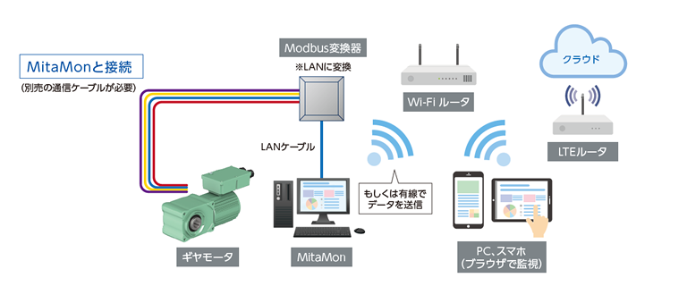 PLC(programmable logic controller)やパソコンをはじめとした有線通信に加え、当社商品の看太郎、MitaMonとの接続により、無線通信のニーズにも幅広く対応、遠隔での常時監視が可能です。