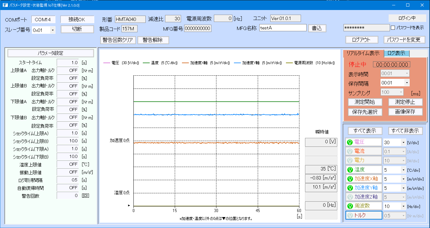 パソコン用ソフトウエアのインストールにより、お客様自身で簡単に、各種データの保存、各パラメータの変更が可能です。パソコンとの接続時には各種値の負荷状況をリアルタイムで波形表示することも可能です。