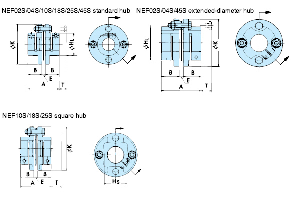 3.The weight, moment of inertia, and GD2 are given for the maximum bore diameter of a round hub. The figures in parenthesis are for an extended-diameter hub for models NEF02, NEF04, and NEF45, and a square hub for models NEF10, NEF18, and NEF25.