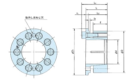 | d | D | ℓ | L2 | L | Lt | t1 | t2 | D1 | Mt | Pax | P | P' | 本数 | サイズ | 締付トルク MA | ||||||
