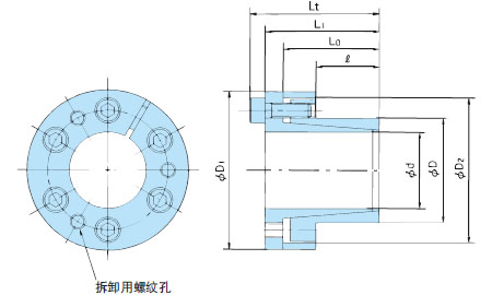 | 尺寸 mm | 传递扭矩 | 轴向负载 | 轴侧面压力 | 轮毂侧面压 | 联结螺栓 | 质量 kg |