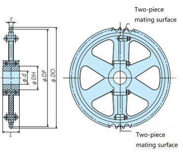 - We offer a lineup of two-piece (C-split type) and replaceable tooth type (ring-type replaceable teeth), which significantly reduces replacement time, parts costs and waste by replacing only the sprocket or worn part without the need to disassemble the shaft, contributing to improved maintenance efficiency, cost reduction, and waste reduction.