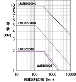 | A14 | Lift Master的预期寿命会根据丝杆的预期运行寿命来进行判断。 梯形丝杠类型(LMEM) 无论升降负荷的大小,当运行距离合计达到5km时即视为已达预期寿命。(参考)滚珠丝杆型(LMEB) 滚珠丝杆的使用寿命取决于滚动面因疲劳而导致的剥落情况。下曲线图数据仅供参考。当使用过程中冲击较多、未及时润滑或未定期进行维护保养的,都会使运行距离极大的偏离预期。 期待运行距离 (km) =实际负荷行程 (m) ×使用频率(次/日) ×运转天数/年×10-3×预期年数 预期寿命因升降负荷而异。在行程途中负荷有较大波动的,请按下式计算等效负载。 PM = PMIN + 2 × PMAX3 PM : 等效负荷 N PMIN : 最小负荷 N PMAX : 最大负荷 N ・该曲线图以滚珠丝杆的L10寿命(约90%以上的滚珠丝杆可达该寿命)为基础绘制而成,L10寿命通过运行距离进行表示。·当使用过程中冲击较多、未及时润滑或未定期进行维护保养的,都会使运行距离极大的偏离预期。 ·对使用寿命有更高要求的,可以考虑更换为更符合负荷条件的滚珠丝杆。 ![]() |
