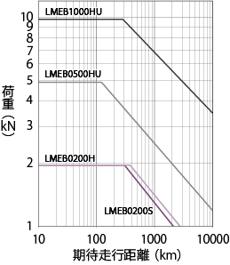 | A14 | リフトマスタの期待寿命はネジの期待走行寿命で判断します。 台形ネジタイプ(LMEM) 期待寿命は、昇降荷重にかかわらず、総走行距離が5kmに達した時点となります。(参考値)ボールネジタイプ(LMEB) ボールネジの寿命は、転動面の疲労による剥離により決まります。下記グラフで概略の寿命をご確認ください。ただし、衝撃が多い場合や、適切な潤滑・メンテナンスが行われていない場合は、期待走行距離が大きく低下します。 期待走行距離(km) = 実負荷ストローク(m) × 使用頻度(回/日) × 稼働日数 / 年 × 10-3 × 期待年数 期待寿命は、昇降荷重に応じて異なります。ストローク途中で荷重が大きく変動する場合は、等価荷重を以下の式にて算出してください。 PM = PMIN + 2 × PMAX3 PM : 等価荷重 N PMIN : 最小荷重 N PMAX : 最大荷重 N ・このグラフは、ボールネジのL10寿命(全体の90%以上が到達する寿命)を基に、走行距離として表したものです。・衝撃が多い場合や、適切な潤滑・メンテナンスが行われていない場合は、期待走行距離が大きく低下します。 ・長寿命を求められる場合は負荷条件に合わせたボールネジの変更も検討します。 ![]() |